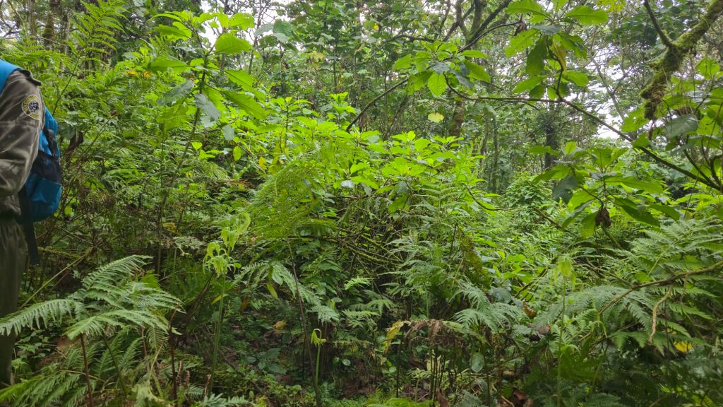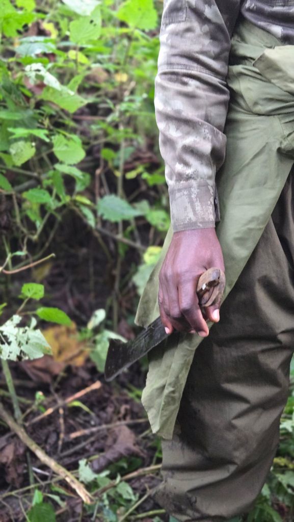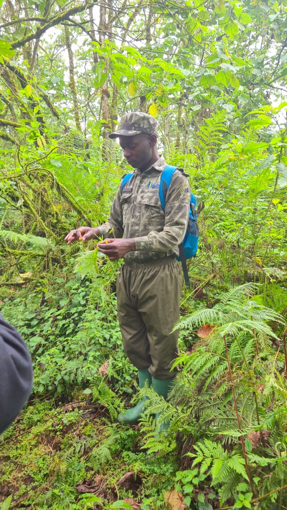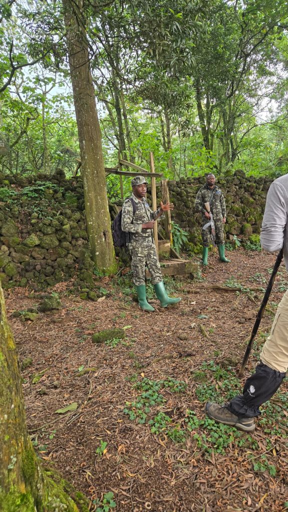 We trekked through fields first, on narrow stony paths until we reached the edge of the Rain Firest, when we were briefed on the dangers of all forest animals, the terrain and our behaviour when we did encounter our Gorilla family.
