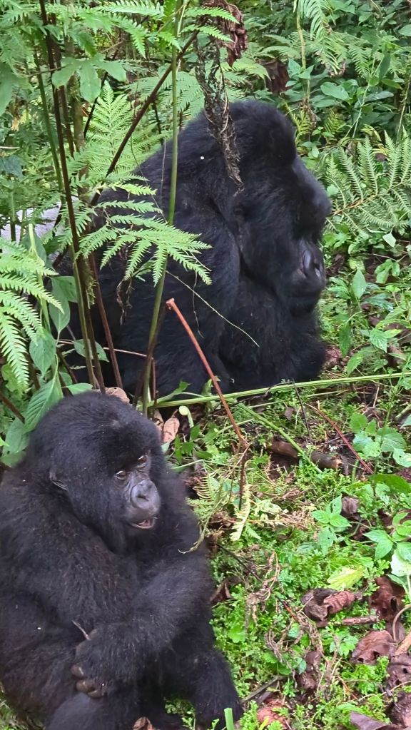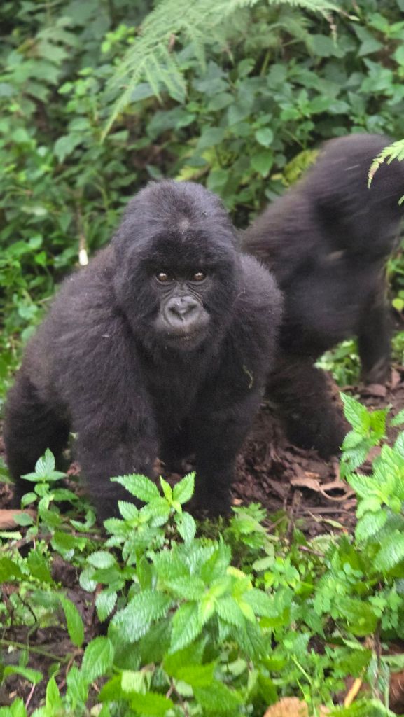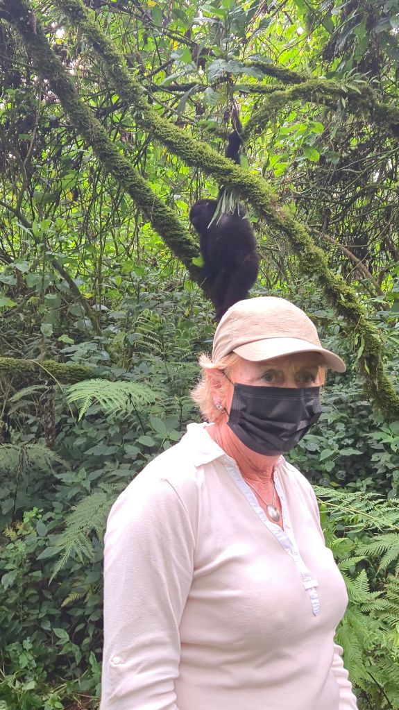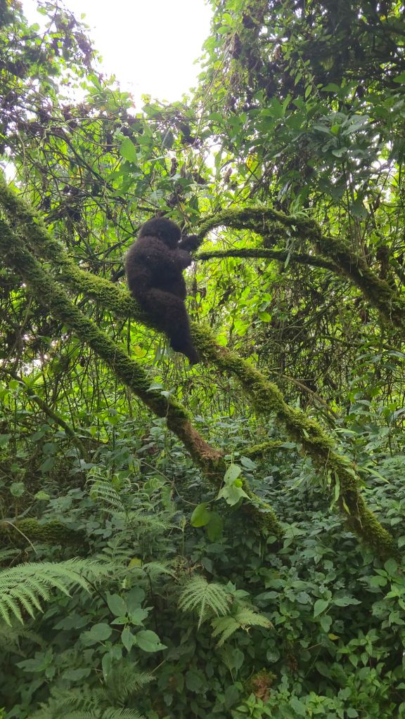 Wow! It was the most incredible privilege to spend an hour in this small area with a family of 30 Gorillas which included 2 Silverbacks, many Blackbacks ( 10 year old males) nursing mothers and babies as young as 2 months ( estimated) and other family members of varying ages and sizes. While we had been advised to keep our distance, the younger ones approached us up very close as they are curious!