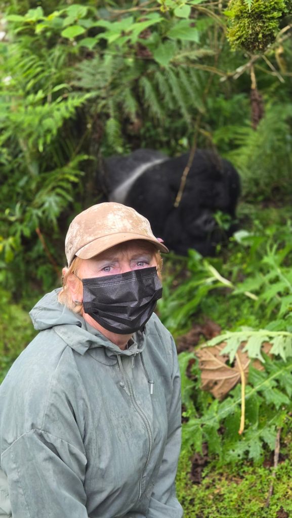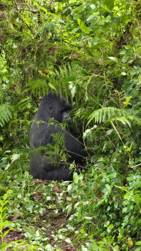 After more than two hours treking through this humid terrain, we were cautioned to be quiet and to stop! The Gorilla family were nearby! We were issued with masks, so as not to infect the animals and we proceeded cautiously. Then I had my first glimpse of these magnificent creatures in their own habitat.